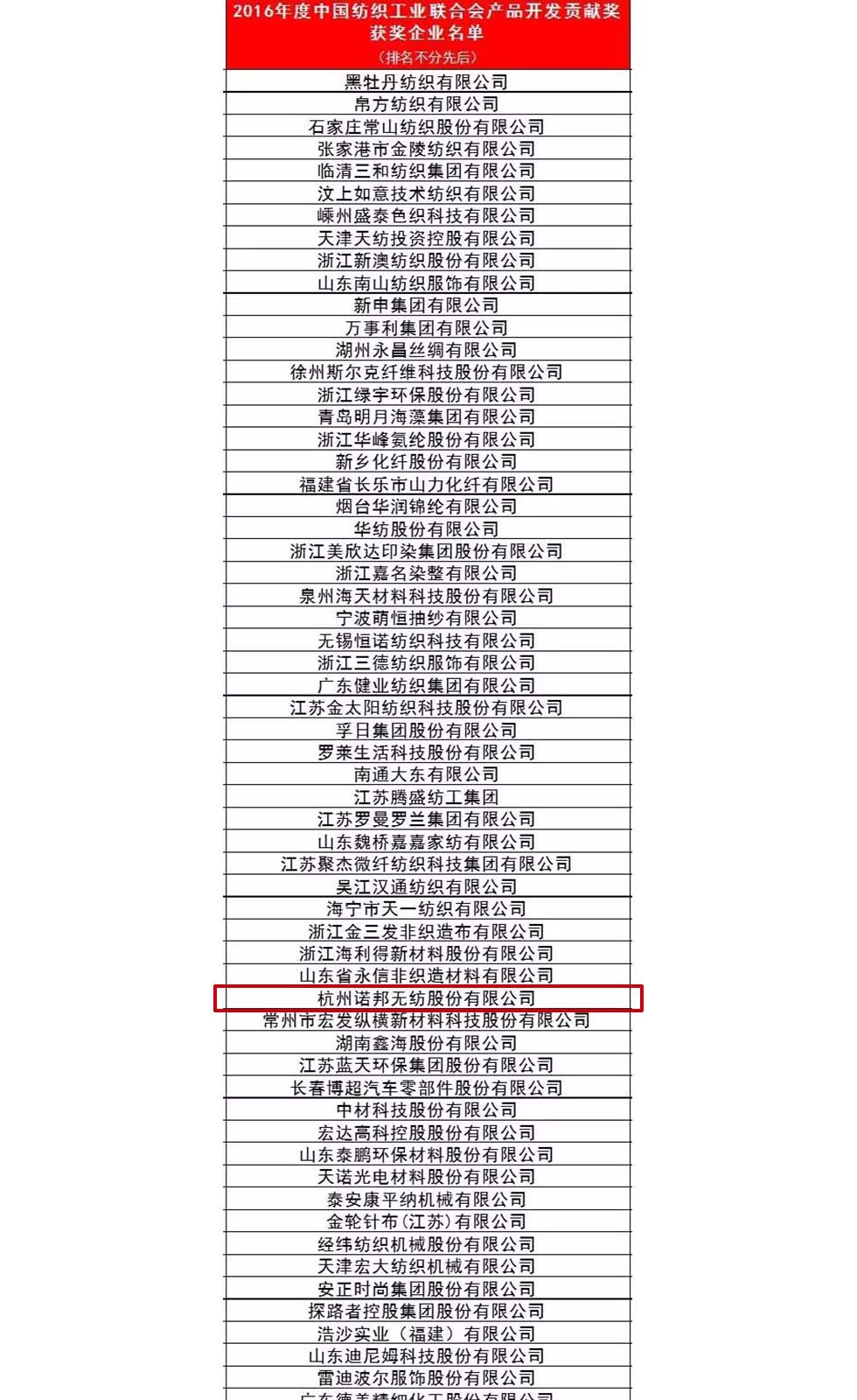 司荣获“2016年度中国纺织工业联合会产品开发贡献奖”荣誉称号,既是行业对诺邦股份在产品研发的技术创新和方式变革上的肯定与鼓励,也是行业对公司未来开发更加先进化、科技化产品的期待与支持。